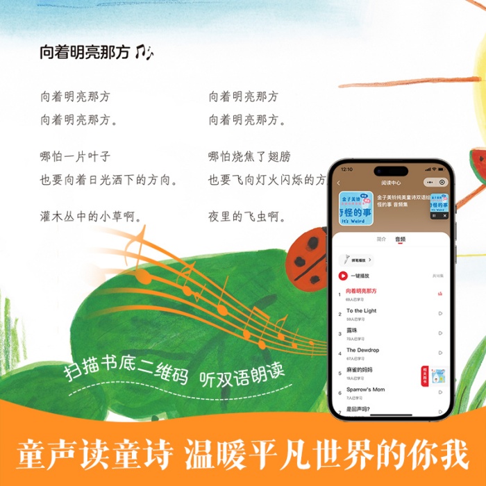 本书是“美铃童诗双语绘本”丛书之一。书中辑录了金子美铃的8首经典童诗《星星和蒲公英》《邻居家的小孩》《狗》《知了的外衣》《鱼满舱》《扑克牌皇后》《全都喜欢上》《心》,用清新的笔调捕捉到孩子生活中天真可爱的想法,读来让人忍俊不禁。金子美铃的诗歌尊重孩子的情感,呵护善良和童真,从生活细微之处捕捉生命之美,语言清澈明丽,打动人心。 全书以中文和英文双语形式呈现,文后添加英文词汇表,随书附赠中英双语音频,能 好地帮助孩子模仿、跟读,在欣赏纯美诗歌的同时,提高语言表达能力。