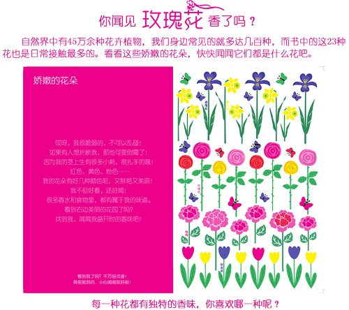 这是一本可以“闻”的书?是的!文字和图片已经不够了!我们需要调动孩子的多种感官,让他在看、听、读的同时,摸一摸、闻一闻,开启敏锐的嗅觉,来闻奇妙的大自然吧!