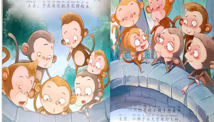 一只小猴子看到井里有个月亮,以为月亮掉到了井里,于是把所有的猴子都叫来想办法。一只老猴子想了个办法,让猴子们一只抓着一只的脚从树上倒挂下来,一直挂到井里,去捞月亮。他们捞到月亮了吗?