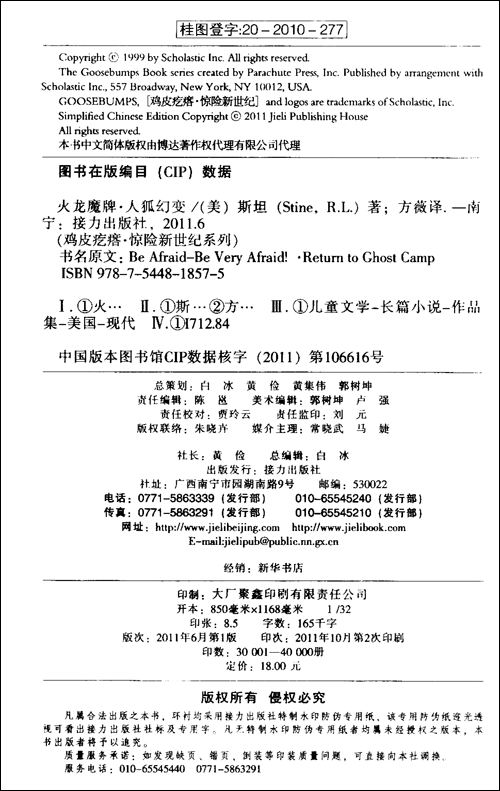《火龙魔牌•人狐幻变》:“鸡皮疙瘩•惊险新世纪系列”是“鸡皮疙瘩惊险新世纪系列”的全新延伸,作品延续了R.L.斯坦天马行空的想象和引人入胜的故事构架,更融入许多神秘莫测的高科技和新奇好玩的奇幻元素。作者以高远神奇的想象和轻盈谐趣的笔敛,为我们创造了一个寓格斗于心巧、化惊恐为神妙、融怿诞于幽默的文学世界。阅读《火龙魔牌•人狐幻变》宛如一场惊心动魄的冒险历程,酣畅淋漓的描写,紧张诡秘的场面,机敏诙谐的人物,让你屏息,让你发笑,也让你思考。