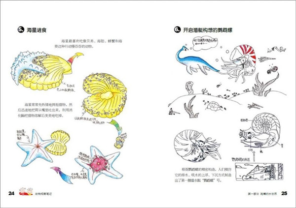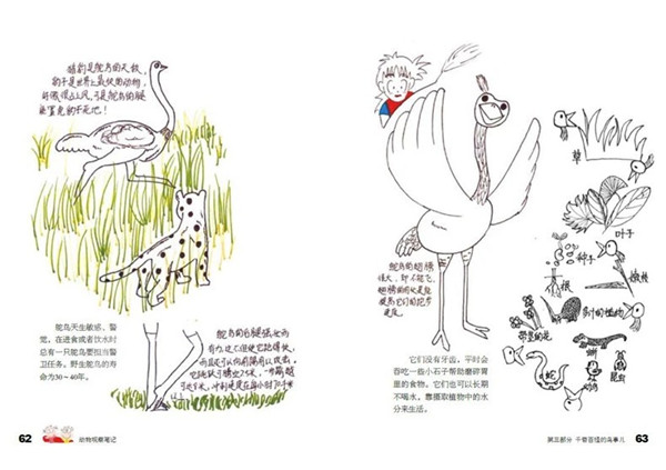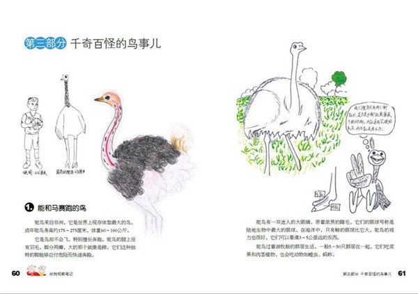 《动物观察笔记》从小学生对动物的好奇心与求知欲出发,围绕动物的特征、特性、生活习性等,用他们自己生动,趣味、探索的绘画与文字创作向我们展现了他们的想象力和探索力,呈现出他们敢于创新、勇于探索的科学态度。其次,体现青少年的探索科学知识过程。《动物观察笔记》是一本科普观察和绘画艺术结合的书;是一本孩子们自己创作的有关动物科普的书,是一本科学老师与美术老师指导、科普专家把关的亲和力极强的书,是一本纸质图书与 APP 应用互动的书。此书分四部分:斑谰的水世界;傻傻分不清的虫;千奇百怪的鸟事儿;哺乳动物萌萌哒。
