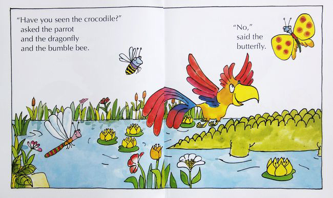 热带雨林里,小动物们正准备要开Party,由于他们很害怕水里危险的鳄鱼会出现,所以每一个小动物出来时都会问别人“Have you seen the crocodile?” 蜻蜓、蜜蜂…和青蛙陆续都说”No”,于是他们就在溪流上唱歌、跳舞,突然有一个声音响起“I've seen the crocodile.” ……幽默有趣,令人发笑!