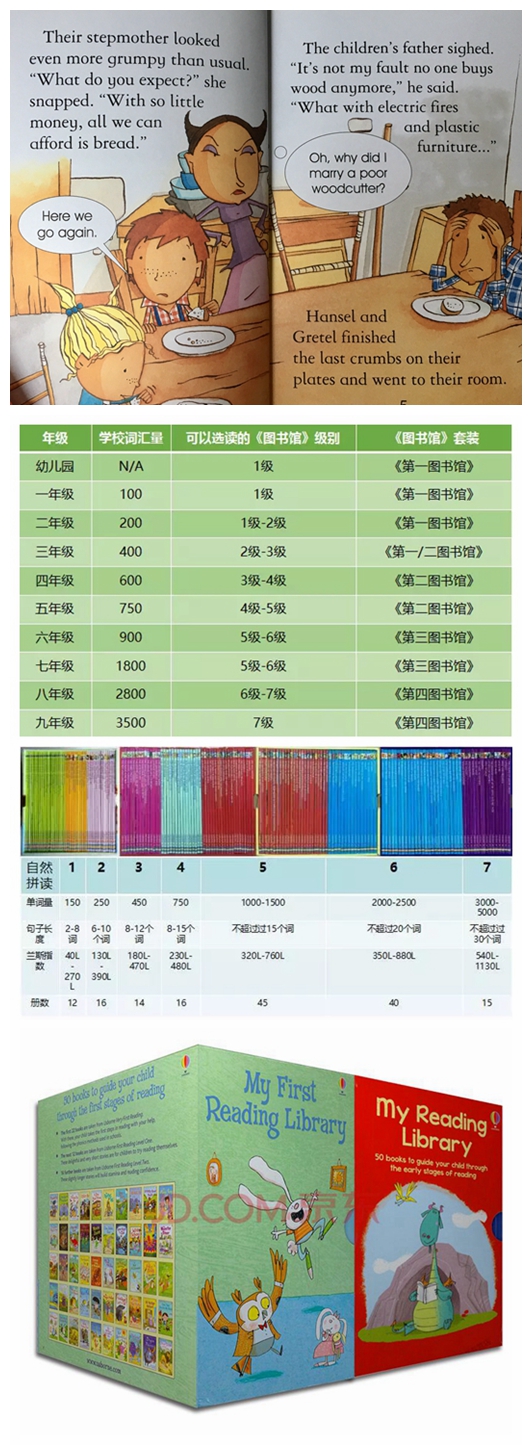 USBORNE图书馆系列到LEVEL5之后,词汇量增加到1000-1500,每页的文字数量在十行左右,共48页,涵盖了英文大部分的语态和时态。从这个级别开始,由图画书逐渐过渡到章节阅读。适合小学五六年级和初中生作为词汇量扩展读本。Level5系列均为世界知名的民间故事和童话故事,学生一般都已接触过中文版本。