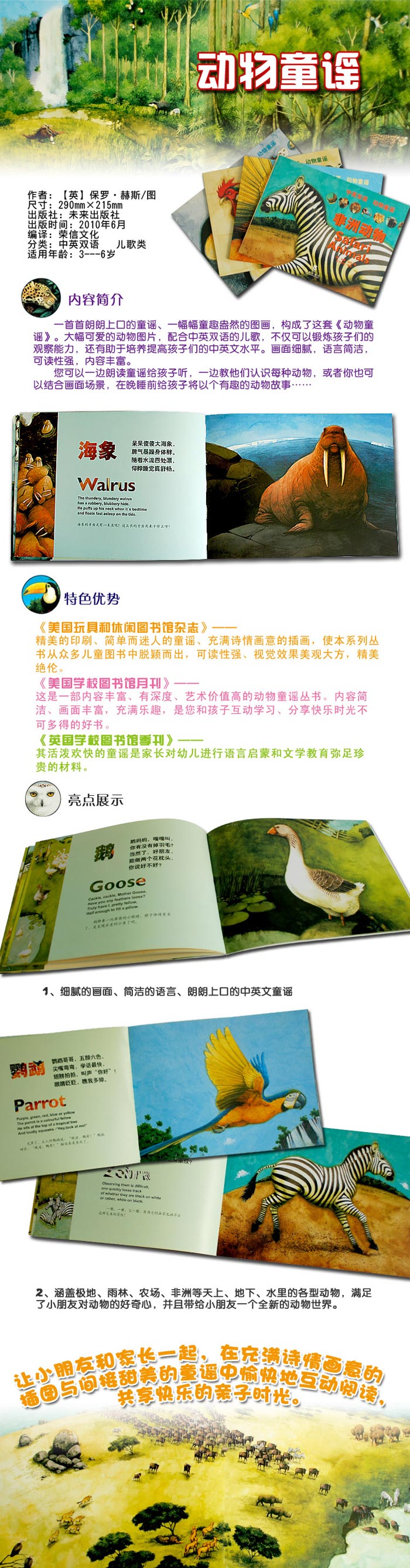 由权威图书出版期刊《美国学校图书馆月刊》及《英国学校图书馆季刊》倾力推荐及点评的一套欢快有趣的动物童谣丛书。画面细腻、优雅,朗朗上口的中英文童谣不但锻炼孩子的语言能力,还让孩子们了解各种各样动物的特点。