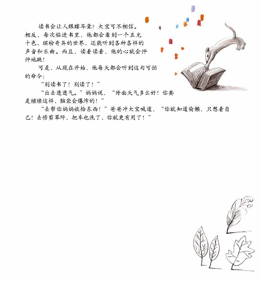 该绘本讲述了一个爱看书的小老鼠的故事。小老鼠大宝因为超爱读书,无时无刻都在读书,家长看见后非常焦虑,进而进行阻止。没有书读,小老鼠大宝感觉世界都没了色彩。但又因为爱读书,因为一次偶遇的阅读机会,小老鼠大宝凭借阅读的积累和阅读带来的自信,报名参加了一个电视节目,并最终获得第一名,这不仅证明了阅读的价值,赢得了父母和邻居的认可和尊重,更是赢得了一个图书馆,影响了父母也开始爱上了阅读。