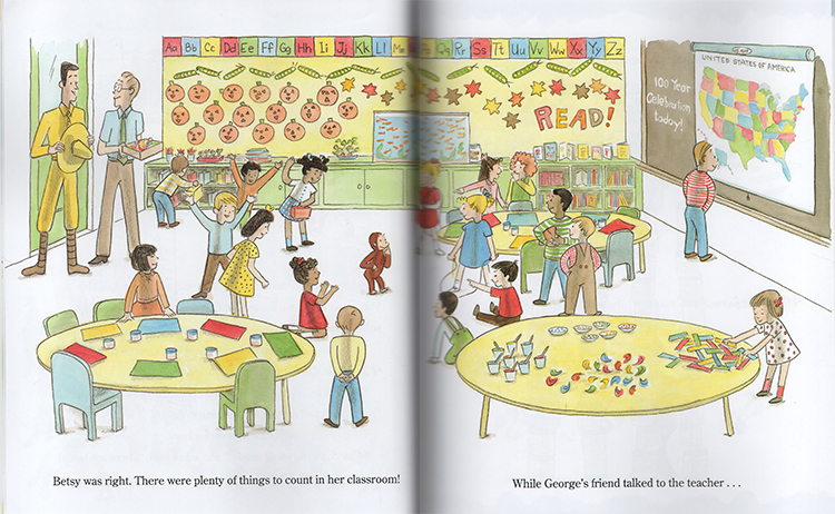 In this large format, paper-over-board book each page features familiar objects for children to count. From home (toys, shoes, plates) to the park (bugs, sticks, clouds) to school (paste, crayons, books) George finds many different things to count. A perfect book for celebrating counting, numbers and the 100th day of school.