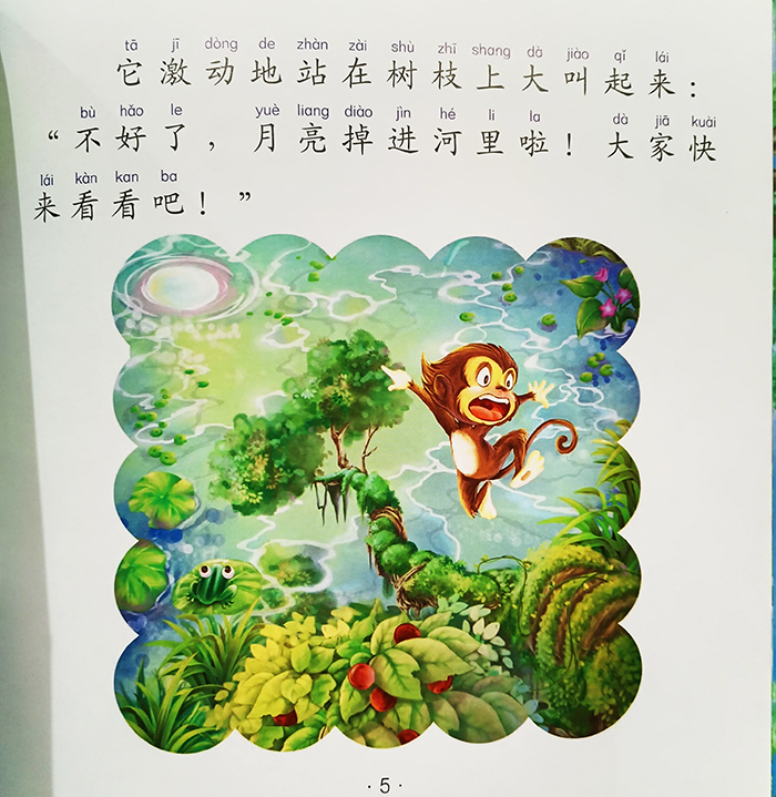 猴子十分高兴,一声唿哨,把群猴集合起来。因为山崖离水面太高,猴子们只好一个拉着另一个的脚,拉成一长串,挂到水面。它们还找来了葫芦瓢,传到最下面那只小猴。它盛了一瓢水就把“月亮”捞在瓢中。一只贪心的小猴抢走“月亮”,于是你争我夺,把一瓢水泼在地上,“月亮”没有了。抬头一看,月亮依旧挂在空中。大家面面相觑,困惑不解。