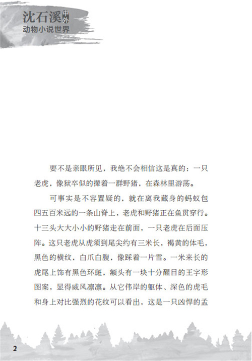 该书由中国动物小说大王沈石溪老师主编,收录了沈石溪和“加拿大诗歌之父”、著名动物小说作家查尔斯·罗伯茨的动物小说作品。包括沈石溪的《野猪囚犯》、《野猪王》,查尔斯·罗伯茨的《月光下的玉米地》、《豪猪的尖矛甲胄》、《盖米特太太的猪》、《盖米特太太和豪猪》和《孤寂水乡的黑公猪》。《野猪囚犯》讲述了一只东北虎看管一群野猪,而野猪们却懒得追求自由,情愿当做老虎的俘虏,故事非常轻松风趣。《野猪王》讲述了一只聪明的野猪与人斗智斗勇,并且有情有义的故事,情节曲折生动,读之引人入胜。《月光下的玉米地》和《豪猪的尖矛甲胄》讲述了豪猪这种倚仗自己的特殊武器——豪刺,睥睨一切的小动物,语言生动有趣,能让读者从小说阅读中了解这种动物。《盖米特太太的猪》、《盖米特太太和豪猪》和《孤寂水乡的黑公猪》这三篇小说,用诙谐轻松的笔调描述了加拿大农民的日常生活以及与农场森林里各种动物的趣事,非常值得一读。