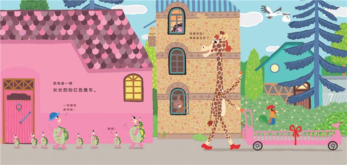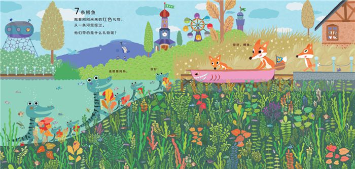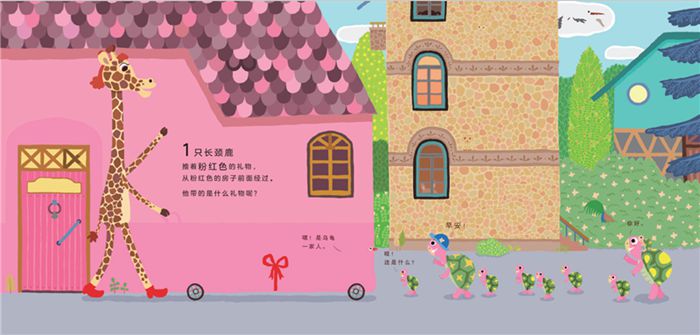 亲子共读时,爸爸妈妈可以和孩子一起猜猜动物们送的是什么礼物,一起玩颜色捉迷藏的游戏,还能认识动物,学习各种形容词和问候语。故事里,每个场景中,相遇的动物加起来是10只,两个相同场景的跨页里,隐藏着数字1到10 。书里面还有很多细节,大家都发现了吗?