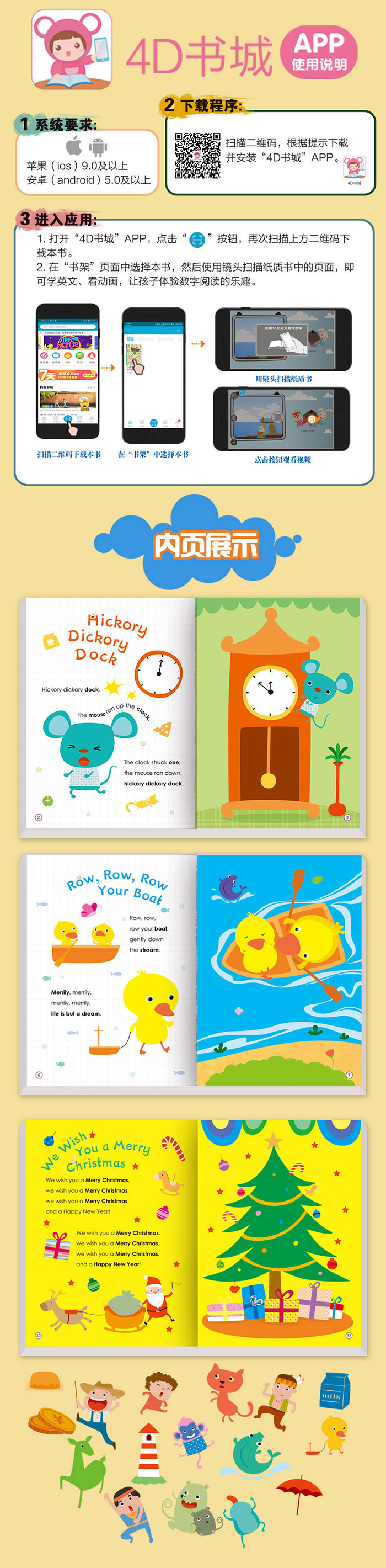 1.30首世界经典英语歌谣精彩呈现!2.AR歌谣动画、优美音频超值奉送!3.纯正的美语,甜美的童声,欢快的旋律,让孩子情不自禁去模仿!4.漂亮的情景画面,生动的童趣形象,奇妙的音画组合,让孩子在“美”中成长!