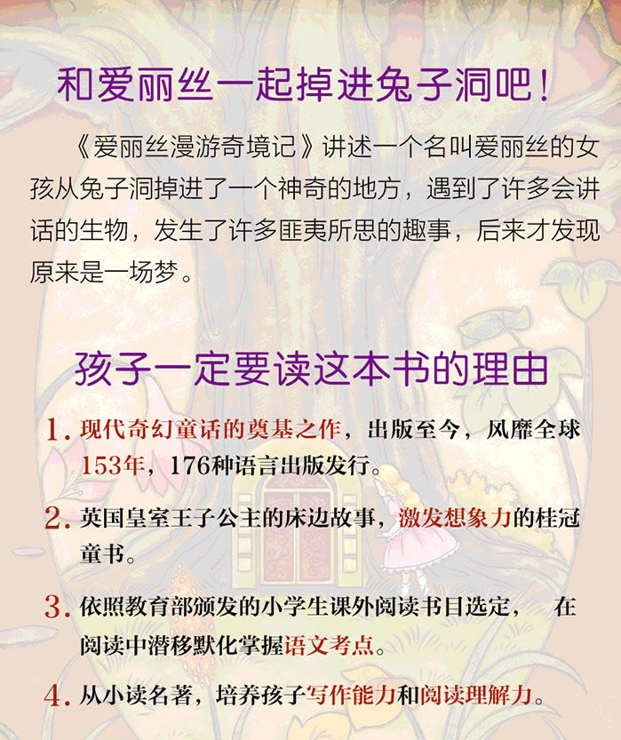 《爱丽丝漫游奇境记》讲述一个名叫爱丽丝的女孩从兔子洞掉进了一个神奇的地方,遇到了许多会讲话的生物,她一会儿变成巨人,一会儿又变成小不点,还遇到了许多匪夷所思的趣事,*后才发现原来是一场梦。