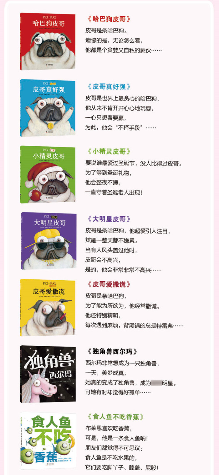 《哈巴狗皮哥》是一套非常适合读给孩子听的故事,和市场上性格形成关键期的温情绘本不一样,这套书是讲的“坏”狗狗的故事,将教育性隐藏在风趣幽默的故事内容之下,用孩子喜欢的方式讲道理,相信会逗得孩子捧腹大笑!10本书分别讲述了哈巴狗皮哥和几个极具个性的小动物的故事,形象非常饱满生动,把皮哥贪吃、不爱分享、爱出风头等坏毛病,和小獾猪渴望友谊、小马想变成独角兽的心理活动勾勒得十分生动,同时作者的插画夸张搞怪,文笔幽默。从这些故事中,孩子都能看到自己的影子。