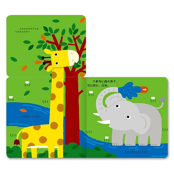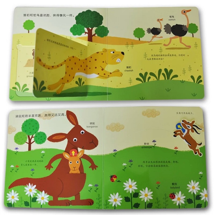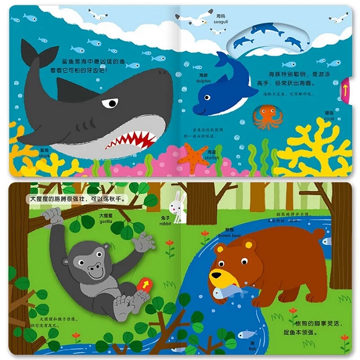 动物世界里,谁跑得快?谁是跳高能手?谁可以用胳膊荡秋千……打开这本书,宝宝不仅能通过推拉翻转滑等趣味游戏,了解野生动物多方面的知识,还能提高专注力、想象力、探索欲、双语学习的兴趣及小手灵活性。