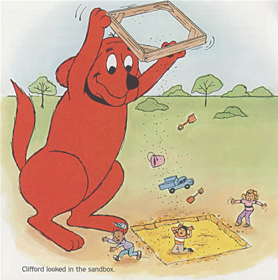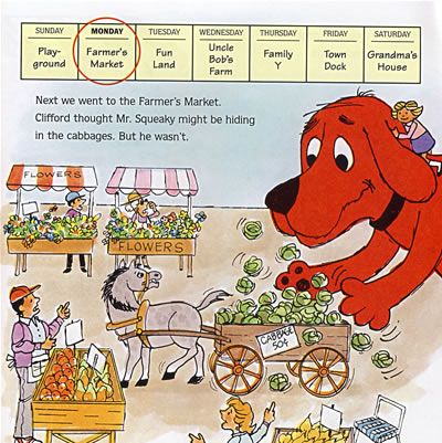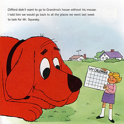 It's Sunday, and Clifford and Emily Elizabeth are going to visit her grandma. But Clifford can't find Mr. Squeaky, his favorite toy mouse!Emily Elizabeth and Clifford return to the places they visited the previous week to look for Mr. Squeaky. On Monday, they went to the playground-no Mr. Squeaky. On Tuesday, they went to the farmer's market-no Mr. Squeaky. Mr. Squeaky isn't at the amusement park they visited on Wednesday, either. Eventually, they find Mr. Squeaky at Grandma's, but not before they look in a pig pen at a farm, and in the water under the dock. Clifford had a busy week!