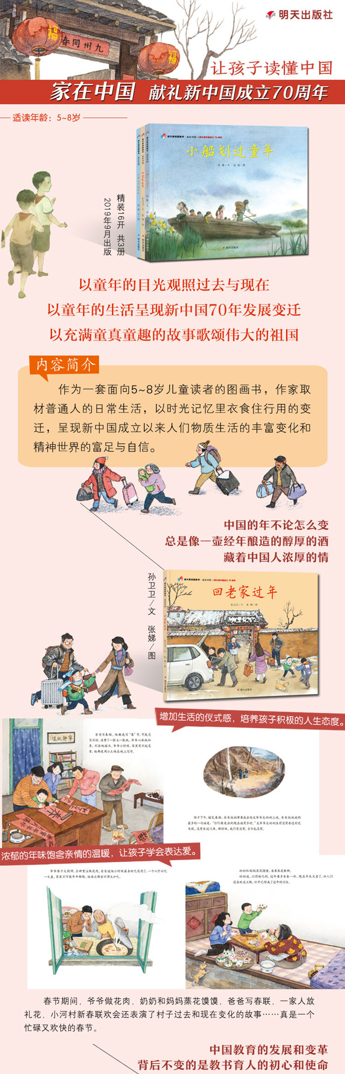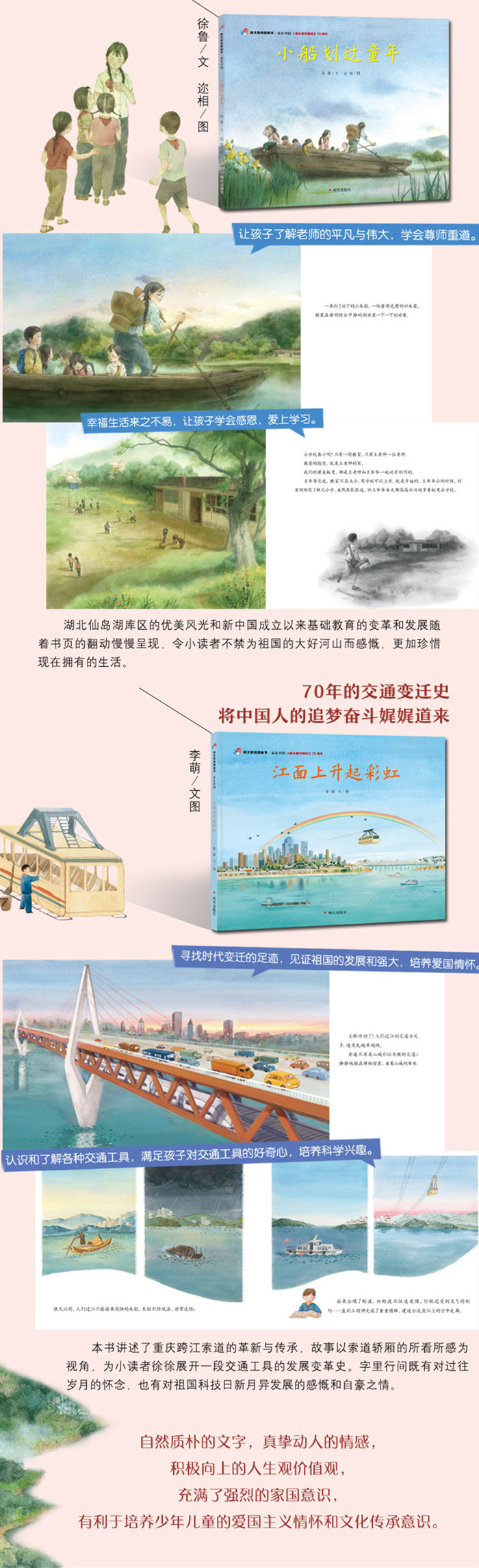 这是一本向新中国成立70周年献礼的主题出版图书。建国70年,国家经济急剧增长,技术空前进步,民族更加自信,人们的生活发生了翻天覆地的变化。作为一本面向5~8岁儿童读者的图画书,作家取材普通人的日常生活,以流水日子里的衣食住行用的变迁,呈现新中国成立以来人们物质生活的丰富变化和精神世界的富足与自信。《江面上升起彩虹》讲述了重庆跨江索道的革新与传承,故事以索道轿厢为*人称,通过轿厢所看所感,为小读者徐徐展开一段交通工具的发展变革史。字里行间既有对过往岁月的怀念,也有对祖国科技日新月异发展的感慨和自豪之情。