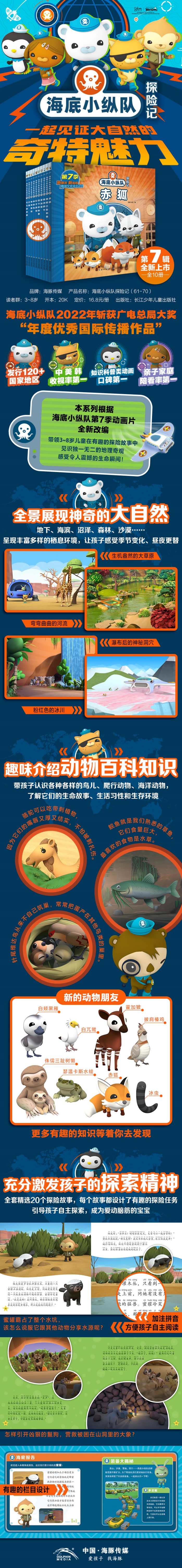 海底小纵队第七季同步故事书《海底小纵队探险记》(第七辑)强势来袭!在《海底小纵队探险记》(第七辑)中,海底小纵队将带领小朋友去往更多神秘的地方,如索科特拉岛、尼罗河、东非大草原等。在那里可以邂逅许多奇妙的动物,像爱偷东西的沙猫、霸道的蜜獾,还有贪吃的鲩鱼。这些动物和海底小纵队之间发生了很多有趣的故事。通过这套书,小朋友能见识到大自然的缤纷多彩,从小培养科学探索的精神,增加知识储备,成为自然科普小达人! 《海底小纵队探险记》系列自出版以来,累计销量达到了,受到了许多小读者的喜爱,经久不衰。这个系列以大自然作为故事背景,融合了探索、环保、科普、生命教育等内容。通过启发性的故事和栩栩如生的插图,让小朋友仿佛置身于真实的大自然中。每一个故事都会抛出一个难题,然后引导小朋友去寻找解决问题的方法,让他们学会自主思考。沙尘暴、物种入侵、海岸侵蚀等多种自然现象的直观呈现,也会让小朋友懂得爱护我们的地球家园。