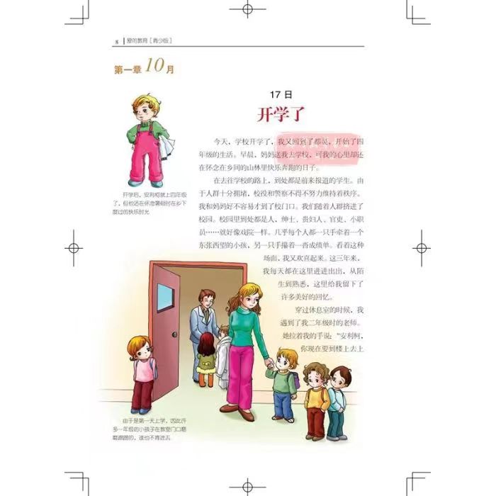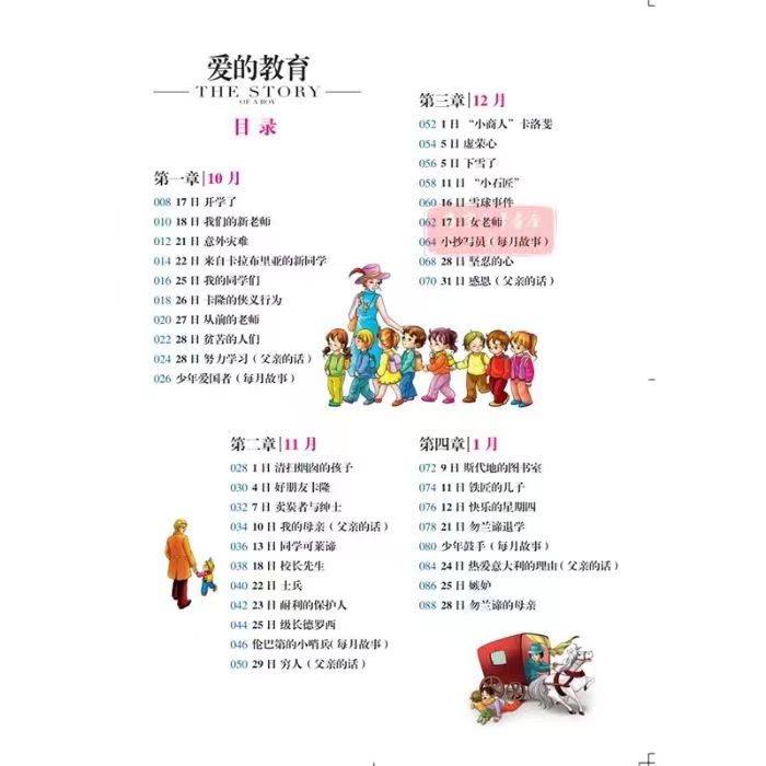 《爱的教育》有一个小男孩,他叫安利柯。在他的身边,发生了许许多多感人的小故事。他把它们都用日记记录了下来。这个日记本里,还有父母写给他的劝诫启发性的文字、老师在课堂上读到的精彩的"每月故事"……现在,就让我们翻开他的日记本,一起去体验热爱学习、热爱祖国、同情弱小、乐于助人、尊敬师长、体贴父母等美好的精神吧。
