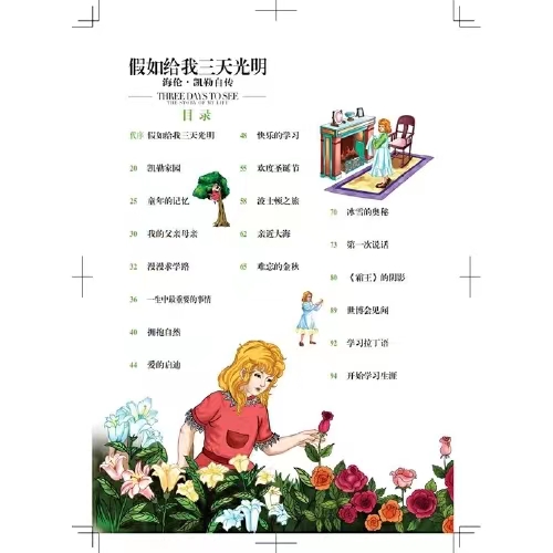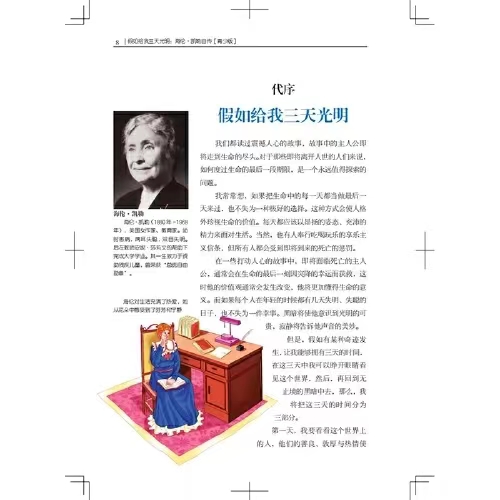 《假如给我三天光明》是美国当代作家海伦·凯勒的散文代表作。该文的前半部分主要写了海伦变成盲聋人后的生活,后半部分则介绍了海伦的求学生涯。同时也介绍她体会不同的丰富多彩的生活以及她的慈善活动等等。她以一个身残志坚的柔弱女子的视角,告诫身体健全的人们应珍惜生命,珍惜造物主赐予的一切。文中配以精美插图,再现了海伦.凯勒不平凡的一生。