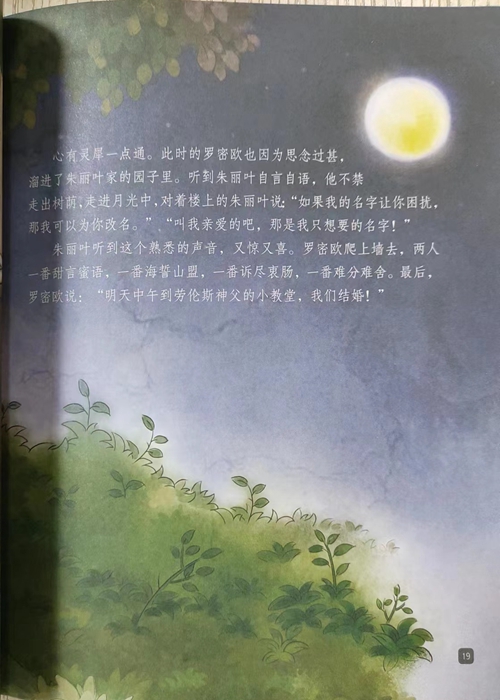 心有灵犀一点通。此时的罗密欧也因为思念过甚,溜进了朱丽叶家的园子里。听到朱丽叶自言自语,他不禁走出树荫,走进月光中,对着楼上的朱丽叶说:“如果我的名字让你困扰那我可以为你改名。”“叫我亲爱的吧,那是我只想要的名字!”朱丽叶听到这个熟悉的声音,又惊又喜。罗密欧爬上墙去,两人一番甜言蜜语,一番海誓山盟,一番诉尽衷肠,一番难分难舍。最后.“明天中午到劳伦斯神父的小教堂,我们结婚!”罗密欧说: 事比