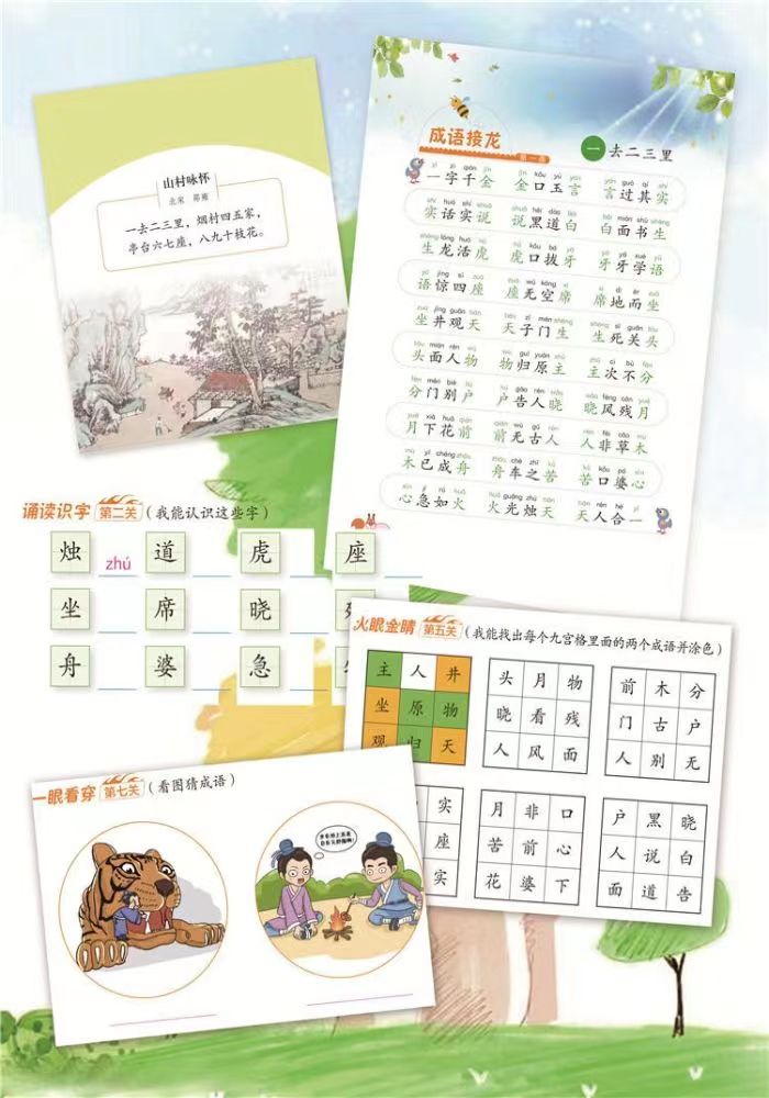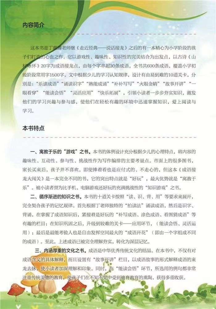 这本书是丁惠臻老师继《走近经典﹣﹣说话接龙》之后的有一本精心为小学阶段的孩子们打造的心血之作。它以游戏性、趣味性、知识性的完美结合为出发点,以古诗《山村咏怀》20字为成语接龙点,由每个字串起30条成语,全书共600条成语,覆盖小学初级阶段常用字1500字。文中根据少儿的学习认知规律,设计有由易到难的10道关卡,分别是:"乐读成语""诵读识字""熟能成诵""补补写写""火眼金睛""故事开讲""一眼看穿""能读会悟""灵活应用""快乐拓展",引领小读者一步步夯实知识,激发他们的学习兴趣与参与感,使他们在轻松有趣的环境中迅速掌握知识,爱上阅读与学习。