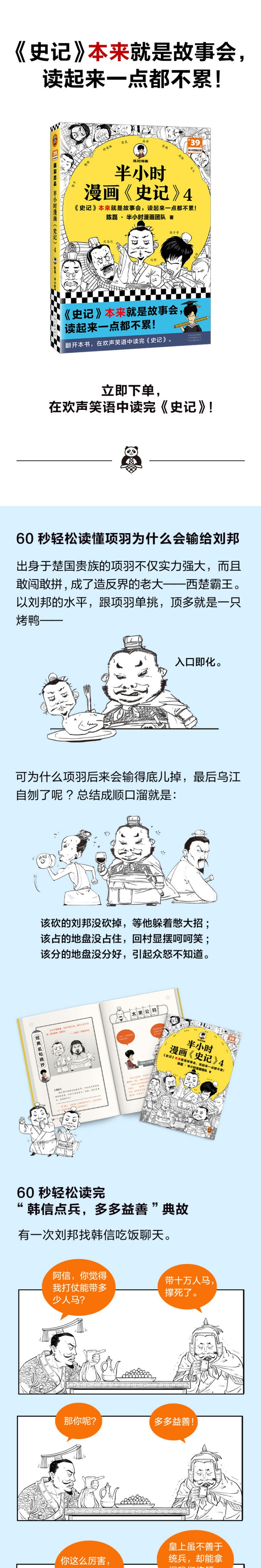 陈磊(笔名:混子哥)领衔的半小时漫画团队通过诙谐的语言和手绘漫画的形式,鲜活生动地演绎了史记中的经典人物和故事。 低调男神汉文帝如何走上高光之路?? 和汉武帝做邻居是种什么体验? 汉武帝的奇葩亲戚们都有谁? ………… 读着读着你会发现,史记本来就是故事会,这样读起来一点都不累! 翻开本书,在欢声笑语中读完史记!