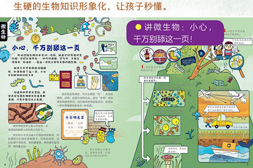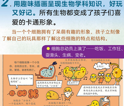 1.由生物学领域知名专家反复审校,确保内容的准确性。 2.标准的教科书知识框架:从细胞运转、微生物到生物关系(共生、寄生、捕食),从消化系统、免疫系统到植物生存的奥秘,以及动物生殖、本能(迁徙、求偶等)、食物链、进化、栖息地等,所选知识点均匹配中学生物教材大纲,提前为孩子打好生物基础。 3.脑洞大开的趣味插画:把抽象艰深的知识转化为浅显易懂的科普漫画,好玩又好记,既培养了孩子的学科思维,又能培养孩子的想象力和艺术鉴赏力。 4.绘本一样的语言风格:绘本式的语言风格,让孩子听科学像在听故事,激发孩子学习的欲望,爱上生物。 5.孩子式的求知思维:以孩子感兴趣的问题为切入点,如讲微生物告诉孩子千万不要舔这一页、植物是如何给自己“做饭”的、像达尔文一样去思考进化……激发孩子对生物的浓厚兴趣和好奇。