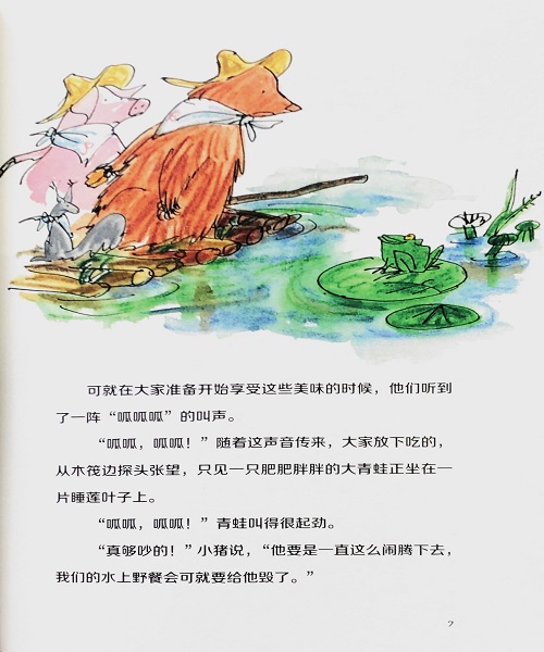 本书是约翰·优曼和昆廷·布莱克合作的图文故事桥梁书,讲述了大熊和朋友们一起去湖面野餐时遇到麻烦的故事。大熊为小猪、小鸡、小刺猬组织了一场水上野餐。好朋友们不仅每位都带上了自己喜欢的野餐食物,还戴上了大熊为大家制作的、绣有各自名字的餐巾。这一切显得十分顺利,就在大家正准备开心地野餐时,他们突然听到“呱呱”的叫声,吵死了。原来,是一群青蛙,他们也想加入野餐会。但大熊和朋友们难以忍受青蛙的聒噪,于是他们转移到一个更安静的水面去野餐。但不幸的是,他们又遭遇了新的麻麻烦,而这时只有青蛙才能帮助他们……