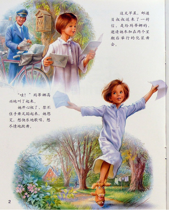 “玛蒂娜”图画风格:“玛蒂娜”故事书系列一帧帧细腻、唯美的优美插图,使孩子们在阅读的同时感受美的熏陶、艺术的启蒙。当父母为孩子们娓娓道来这一个个平凡而又美妙的故事时,孩子们的思绪在这些图画中慢慢飘荡开来,和玛蒂娜一起畅游乡村、树林、郊外,感受在真实生活中所没有的艺术世界。在这些优美的图画中游历过的孩子们,他们的眼中浸润着纯美的色彩、艺术的感性,对美的憧憬和向往。当这些蕴含着艺术灵性的目光投向我们的现实生活时,每一天庸常的生活都被他们点燃,爱和美会无时无刻不陪伴在他们身边。那是一双双发现美的眼睛,也是一双双充满力量的眼睛。