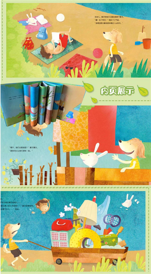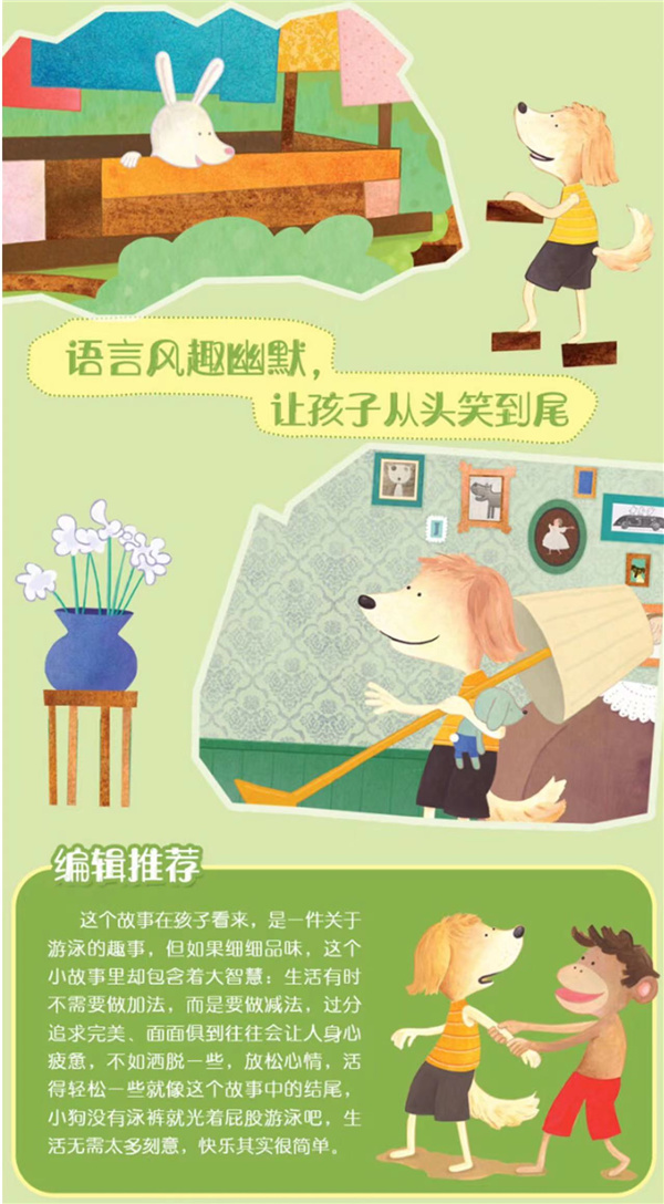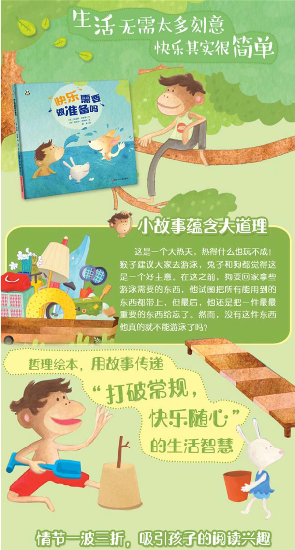 天真热,热得什么都玩不成! 猴子建议去游泳,兔子和狗都觉得这是一个好主意 在此之前,狗要回家拿些游泳需要的东西, 他试图把所有能用到的东西都带上,可还是把一件最最重要的东西给忘了。没有这件东西,他真的就不能游泳了吗?