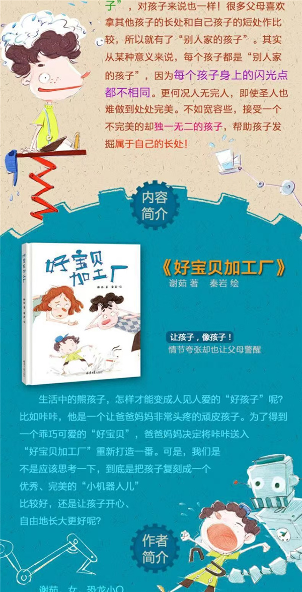 生活中的熊孩子,怎样才能变成人见人爱的“好孩子”呢? 比如咔咔,他是一个让爸爸妈妈非常头疼的顽皮孩子。为了得到一个乖巧可爱的“好宝贝”,爸爸妈妈决定将咔咔送入“好宝贝加工厂”重新打造一番。可是,我们是不是应该思考一下,到底是把孩子复刻成一个优秀、完美的“小机器人儿”比较好,还是让孩子开心、自由地长大更好呢?