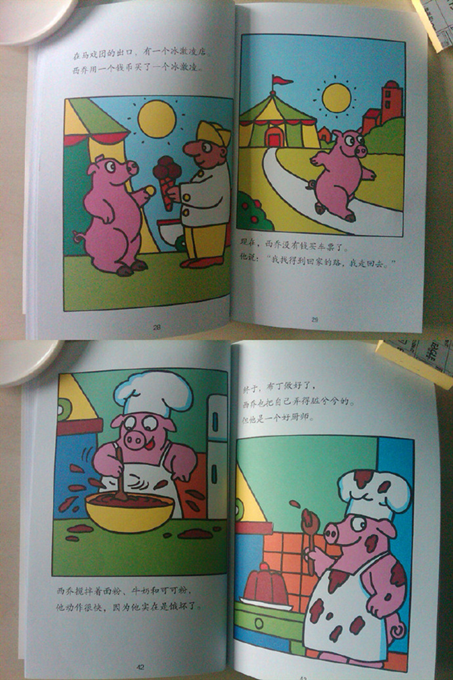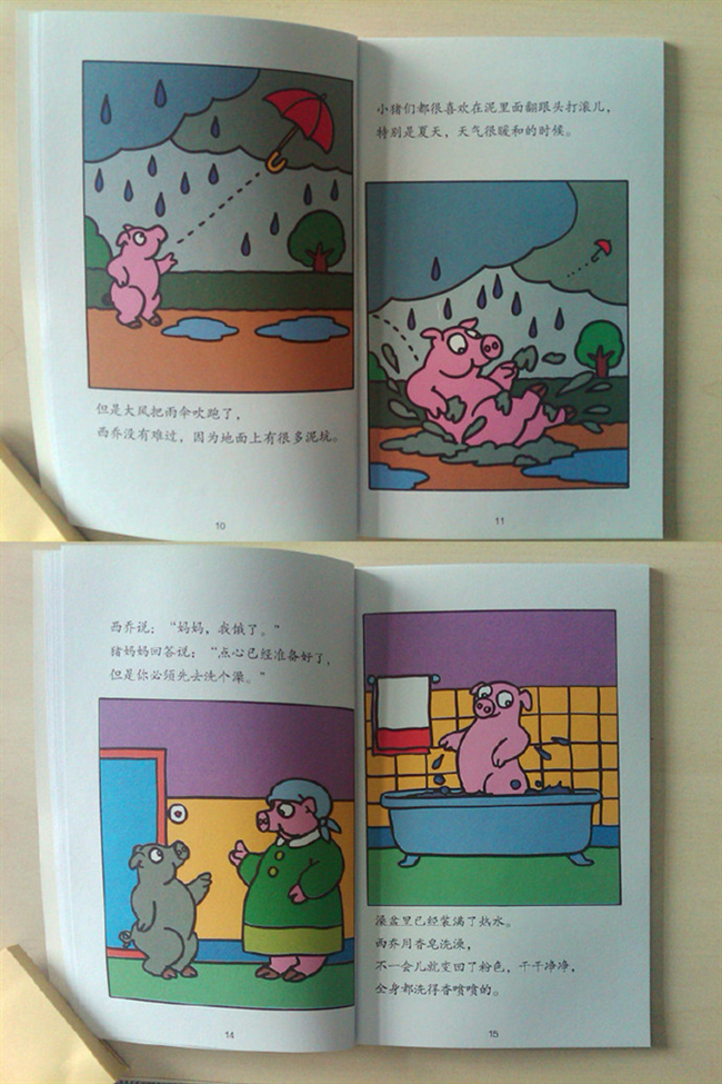 第一个故事《泥中翻跟头》,讲述了西乔在雨中的泥坑中尽情的玩耍,当然,重点是玩耍后很脏,洗一下澡就变得干干净净。这个小故事告诉了孩子要养成爱洗澡的好习惯,可以让孩子知道洗澡是很快乐的。