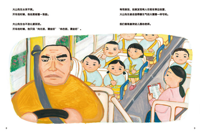 大山先生是幼儿园校车的司机,他在驾驶校车的时候总是板着一张脸,所以在幼儿园里很不受欢迎。但是后来孩子们看到了,他看到盛开的郁金香会笑,会偷偷把孩子们弄坏的椅子修好,会在举办运动会的时候为孩子们加油……大山先生虽然看起来很可怕,但其实是很温柔的一个人。书中幼儿园的小朋友们并没有被大山先生的外表所“迷惑”,他们发现了大山先生真正的样子,*后毕业典礼的画面几乎让人感动的落下泪来。
