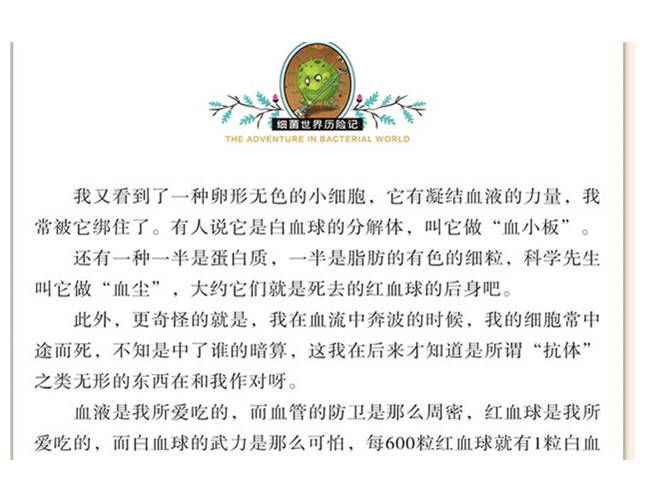 在这本《细菌世界历险记》中,高士其爷爷彻底揭去了科学神秘的面纱。他用拟人化的手法,通俗易懂的语言,将深奥、神秘的科学讲得形象生动,明白晓畅。他以其诗人的情怀和极具人性化的笔触,为读者展现了一个精妙的科学世界,让读者在与其零距离接触的同时,又能沐浴文学的清辉,乐享知识繁荣滋养。