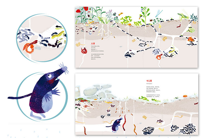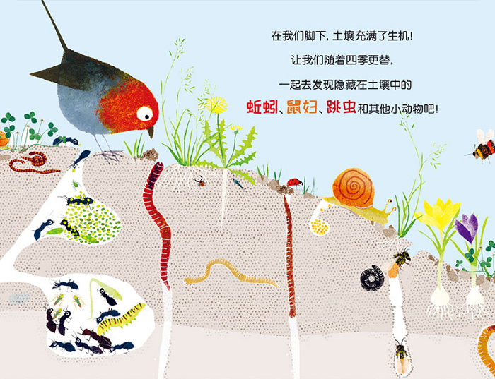 上海昆虫博物馆馆长、科普部主任 中山大学生物博物馆馆长联袂推荐;?属于孩子的一次探索之旅 能让小读者从中发现、寻找、查阅100余种熟悉又陌生的动植物;?前后环衬配有中英双语“图鉴” 边读绘本边认知;?以环境与自然为主题 读者在绘本中观察小动物的同时 也能潜移默化的体会到自己在大自然中所扮演的角色 感悟自然、感悟生命;?换个角度看世界 告别对泥土“脏兮兮、黑乎乎”的刻板印象;?以土壤横截面的形式 将隐藏在土壤里的事物呈现得淋漓尽致;?逐月呈现画面 小读者们能深切感受到一整年的环境变化 以及观察到生活在我们脚下的许许多多小动物们一年到头的生活细节;?大开本画面 细节呈现清晰 画风清新 文字诗意