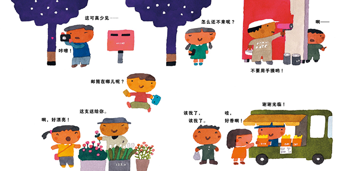 这些生活中随处可以听到的情景对话都被五味太郎先生收入到这部绘本中。校园、街边、工地、商场、操场、游乐场……这些场景都没有明确注明,但通过人物对话,我们都可以清晰认识到场景发生在哪里。