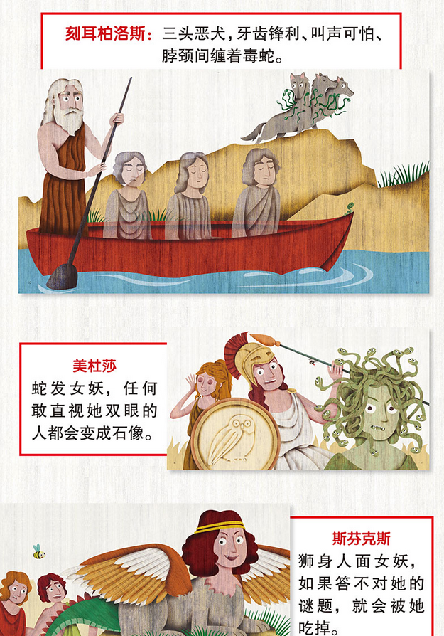 希腊神话源于古希腊人世代相传的神话故事,是古希腊人智慧的结晶。在希腊神话中众神和英雄的形象无处不在,主神宙斯、天后赫拉、海神波塞冬、智慧女神雅典娜……这些都是大家耳熟能详的名字,围绕他们展开的故事也是天马行空、光怪陆离,可以毫不夸张地说希腊神话就是打开西方文明世界的那把金钥匙。《希腊神话:妖怪与幻兽》选取了20 篇希腊神话中与妖怪和幻兽有关的故事,并通过意大利画家玛丽莎•维斯蒂塔富有表现力的画作将怪兽的形象呈现在小读者面前,让阅读更加轻松愉快。