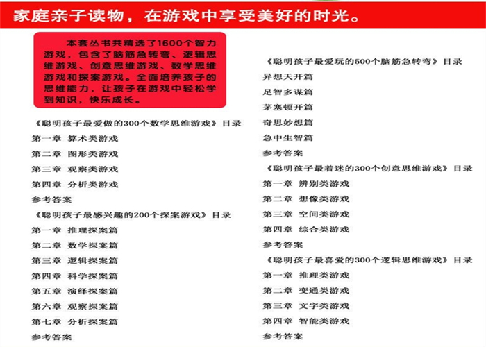 《聪明孩子最着迷的300个创意思维游戏》精选300个创意思维游戏,旨在运用这些游戏,激发小学生的创意思维,使他们在实际学习和生活中学会用创造的眼光看问题,用创新的方式解决问题,真正成为自己大脑的掌控人,学习更进步,能力更突了。