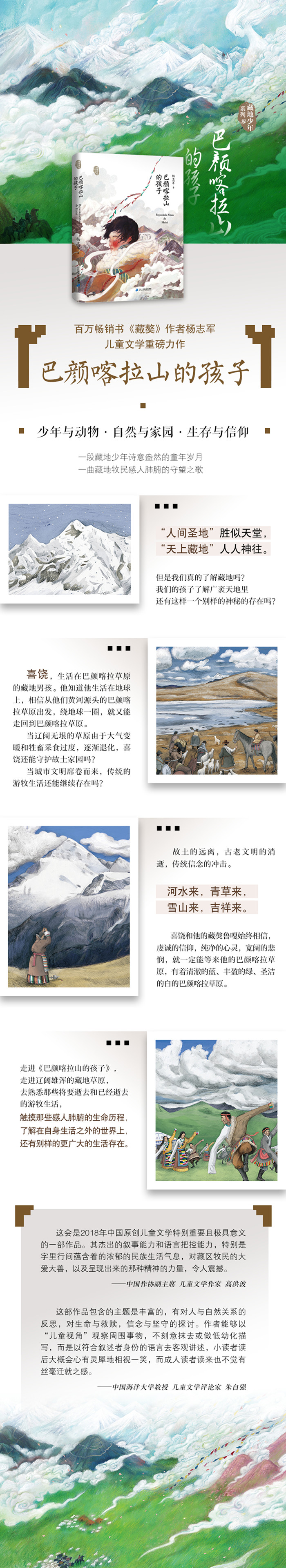 《巴颜喀拉山的孩子》是著名作家杨志军的儿童文学力作。该书以儿童的视角,讲述了位于黄河源头的巴颜喀拉草原,由于大气变暖和牲畜采食过度面临退化,藏民们为了生存,不得不放弃草原走向城市,后因为对故土的眷恋、对信仰的坚持,重新返回草原,改造家园生态的故事。作品再现了藏地少年诗意盎然的童年岁月与心灵世界。气势恢宏,地域韵味浓烈,在展现藏族地区风土人情的同时,也流露出“落后”的牧民生活和“先进”的都市生活的矛盾与冲突、融合与调适,昂扬着蓬勃的民族精神和时代气韵。作品体现了人与自然的和谐统一、人与动物的和睦相处,表现藏族孩子对美好自然的向往、对父辈善良美德的继承、对信仰的坚守等,洋溢着藏族地区的原始血性、魔幻色质和史诗般的奇妙想象。