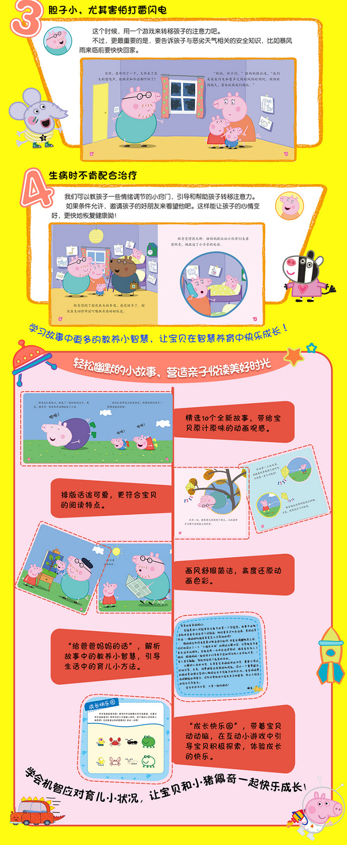 每个孩子都是天生的探险家,他们总是对周围未知的世界充满热情,拥有惊人的能量值,能够不停地去探索、去尝试、去体验各种新鲜好玩的事情。在孩子实现自我成长的过程中,我们要做的是在尊重和保护孩子自主和个性的基础上,巧妙应对养育过程中出现的状况。在这套书中,小猪家的家长们就用自己的教养智慧为我们解答了十个育儿难题。例如:晚间,如何让精力旺盛的孩子乖乖按时睡觉?怎样应对孩子在身体不适时表现出来的一连串抗拒反应?孩子害怕打雷闪电,用什么办法能够有效安抚他们的恐惧情绪呢?在亲子阅读的过程中,爸爸妈妈可以通过书里的互动游戏,帮助孩子更好地探索世界;还可以借鉴和吸收故事中的教养智慧,巧妙应用到日常的育儿生活中。用一种不说教、无冲突的积极养育方式,拉近亲子关系,营造欢乐和谐的家庭氛围。