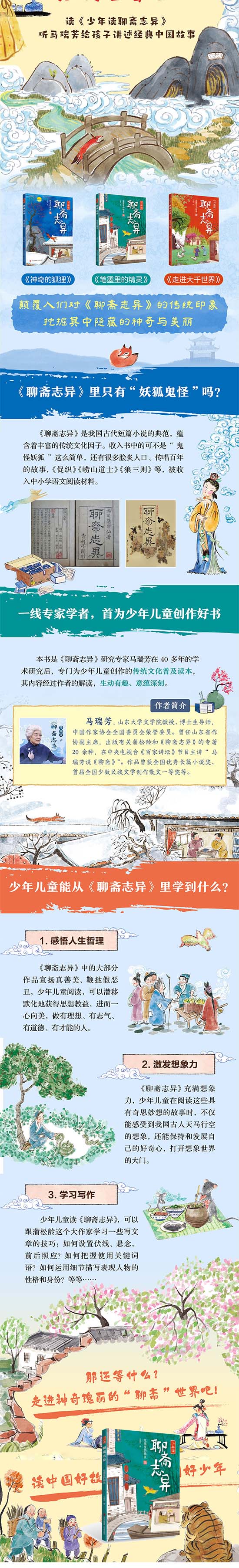 《聊斋志异》是清代著名文学家蒲松龄创作的短篇小说集,它是我国文学艺术宝库中的一颗明珠,汇集奇谭、异闻,具有很高的阅读价值。 《少年读〈聊斋志异〉》由《聊斋志异》研究专家、中央电视台《百家讲坛》主讲人马瑞芳精心选编而成。全书改编了50余篇适合少年儿童阅读的《聊斋志异》经典故事,用通俗易懂、形象生动的语言娓娓道来,并对《聊斋志异》的思想内容、写作手法、文化背景等进行了深入浅出的分析,带领少年儿童走进了瑰丽神奇的“聊斋”艺术世界。