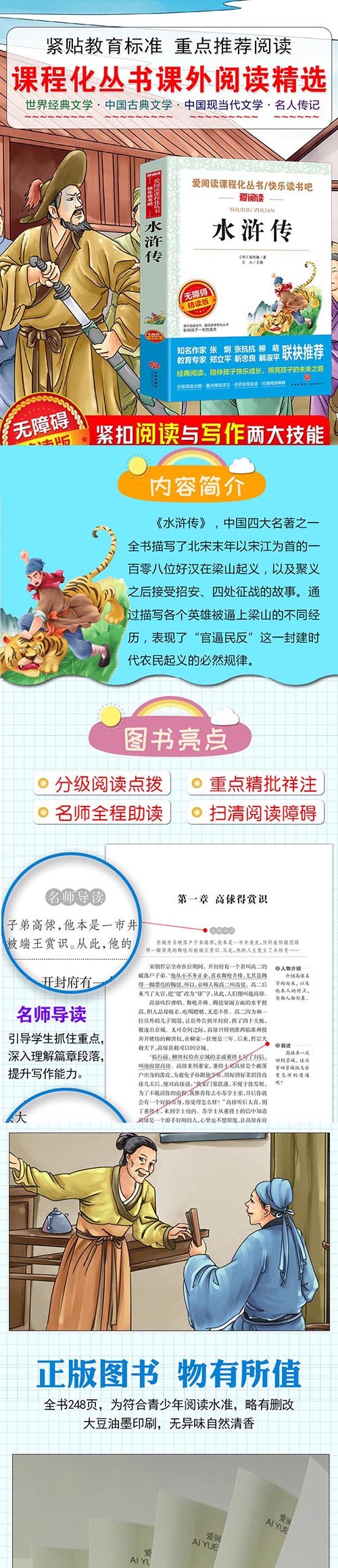 书中刻画了一批以宋江、吴用、鲁智深、林冲、武松、李逵、孙二娘等为代表的家喻户晓的英雄人物形象。108位梁山好汉的出身、经历和遭遇各有不同,代表着社会不同层面的人群,更烘托出朝政混乱下官逼民反的大主题,反映出市民阶层抵制暴政、向往自由的人生追求。