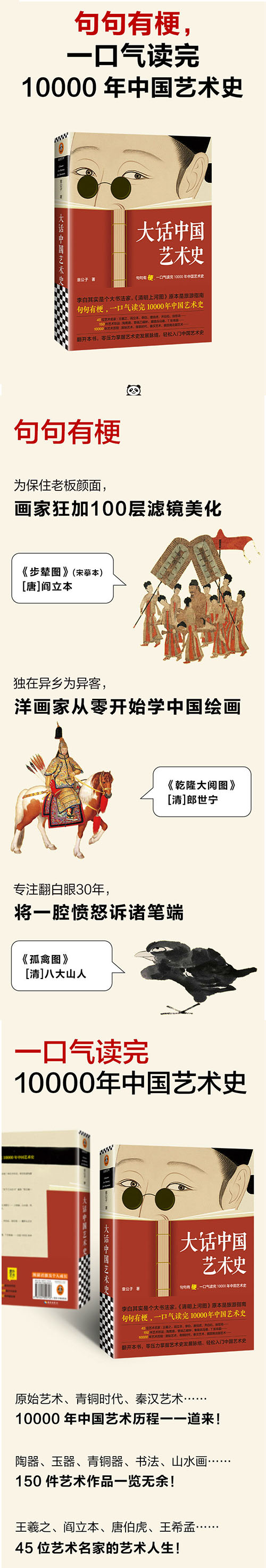 本书从原始社会的陶器说起,内容涵盖了陶器、玉器、青铜器、草书、行书、山水画、工笔画等多种中国特有的艺术形式,时间跨越了秦、汉、唐、宋、元、明、清、近代等多个时期。 意公子用她独有的视角,以时间为写作脉络,通过我们耳熟能详的艺术珍品串联起了这波澜壮阔、脉络纵横的艺术历程,配上简洁生动幽默风趣的语言和丰富精美的图片,带领读者重现认识中国艺术的发展脉络,体会中国艺术的精神内涵,感受中国这片土地独有的艺术色彩。