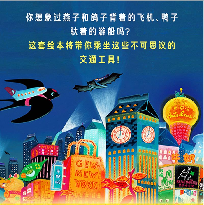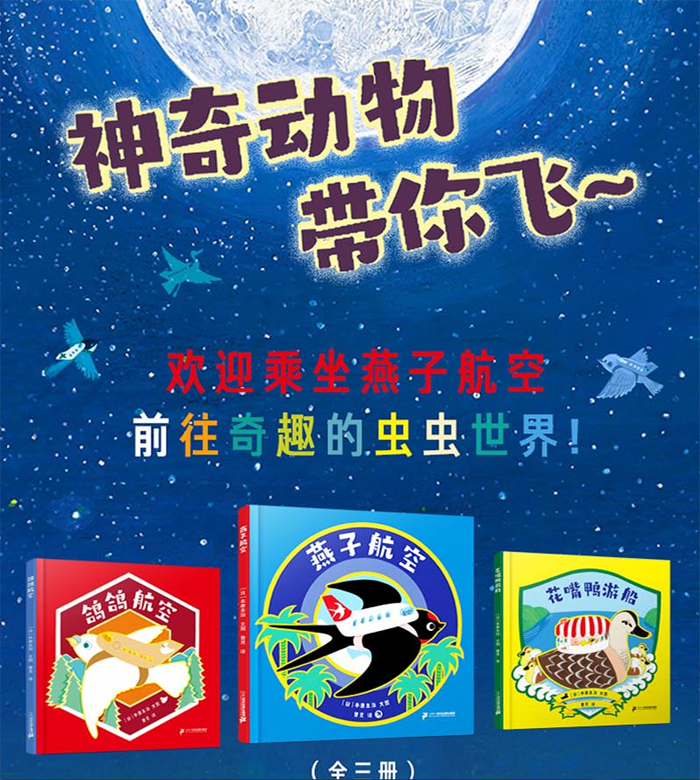 你想象过燕子和鸽子背着的飞机、水鸭驮着的游船吗?这套绘本将带你乘坐这些不可思议的交通工具!不仅能体会到旅行的兴奋、美丽的景致,还有个性鲜明的虫虫们纷纷登场,有趣的细节让人百读不厌。 《燕子航空》:燕子们背上一架飞机,就能嗖地一下带领乘客飞往南之岛。美味的飞机餐、美丽的夜景……青蛙一家对他们的首次空中之旅充满了期待。 《鸽鸽航空》:马上就要到冬眠的季节了,青蛙一家准备去乡下的奶奶家过冬,但本来应该乘坐的航班却因为鸽子睡着了而停飞。好在有惊无险,乘客们升级到了白鸽飞机的头等舱,舒舒服服地享受着空中旅行。 《花嘴鸭游船》:动物们乘着花嘴鸭游船,一边慢慢地在河上行驶,一边观赏自然风光,这真是再美好不过了! 但途中突然下起了雨,在桥下,动物们开始了意想不到的音乐会,还看到了雨后美丽的彩虹,真是美好的旅程!