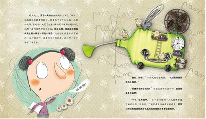 3.诙谐幽默的故事情节,夸张的手绘插图.《旋转的齿轮书》共八册,每册有五故事,每一个故事都充满了无限的想象力,简直就是小朋友内心世界的真实写照。比如:害怕衣柜里小怪物的小女孩可可啦,不愿意与小伙伴分享玩具的小男孩尼克拉斯啦,每一个都和我们的小读者一样可爱呢。该书绘画风格细腻精致,飞舞的蝴蝶、破壳而出的小鸡、地板上的机器人。
