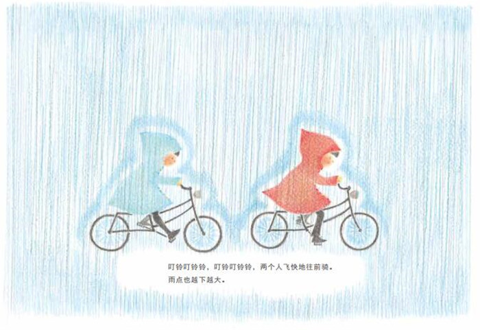 对孩子而言,骑上自行车,就代表独立探险的开始——温馨的故事,神奇的冒险,来自动物朋友们的美妙馈赠,让孩子发现大自然的美好与诗意。 两个齐刘海、短头发的双生姐妹,骑着她们的自行车到森林各处去散步,甚至还缩小了到原野上游玩。一路上,她们遇见各式各样的鸟兽和昆虫,来到动物们的世界里,认识了很多好朋友。 在这个系列里,每一本都将去不同的地方,比如小镇、森林、冰雪森林、海底、地下、原野。 本集中,两个齐刘海、蓬蓬头的双生姐妹仍然打算骑着她们的自行车去往森林,有所不同的是,今天森林的上空飘来了灰沉沉的云。趁雨还没有下,赶紧出发吧!可骑着骑着,雨渐渐下起来了,她们遇见了只有在雨天才营业的雨天咖啡馆。各式各样的鸟兽和昆虫都会在这里躲躲雨,喝喝茶,度过一个美妙的下雨天……剩下的奇遇,就不能再多说啦。