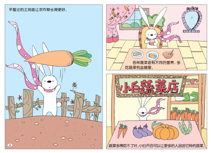 3.主人公兔子小白造型天真可爱,画风清新明亮,故事内容贴近孩子生活。