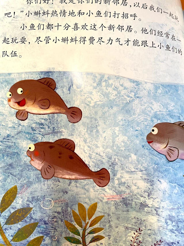 荷塘里,一群小鱼在游玩嬉戏。不知道什么时候,一只小蝌蚪也加入到鱼群里来了。“你们好!我是你们的新邻居,以后我们一起玩吧!”小蝌蚪热情地和小鱼打招呼。小鱼们都十分喜欢这个新邻居。他们经常在一起玩耍,尽管小蝌蚪得费尽力气才能跟得上小鱼们的队伍……