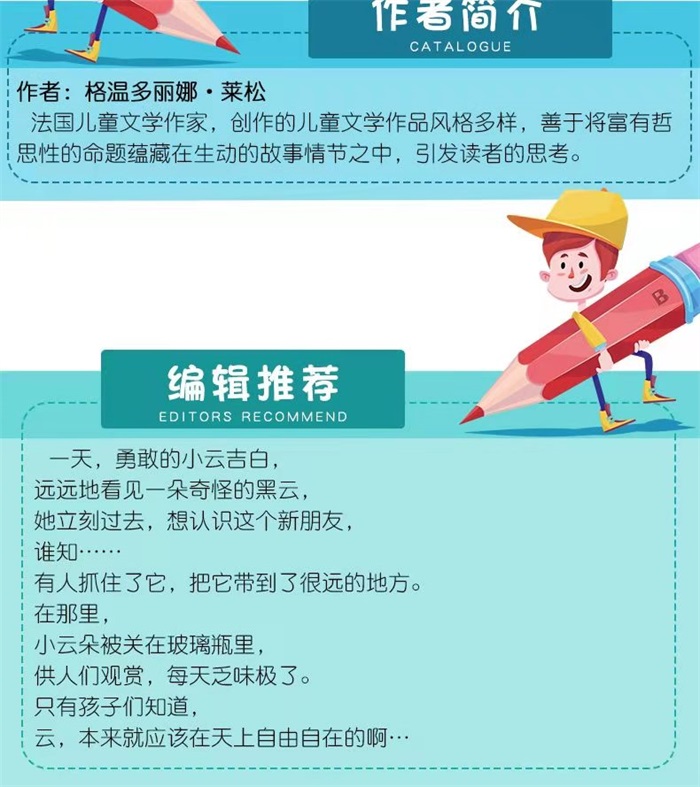 一天,勇敢的小云吉白, 远远地看见一朵奇怪的黑云, 她立刻过去,想认识这个新朋友, 谁知…… 有人抓住了它,把它带到了很远的地方。 在那里, 小云朵被关在玻璃瓶里, 供人们观赏,每天乏味极了。 只有孩子们知道, 云,本来就应该在天上自由自在的啊……