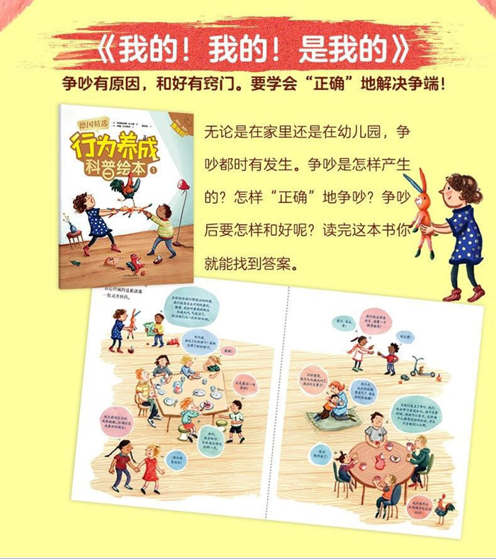 这是一套适合3至6岁孩子阅读的绘本。 《我的!我的!是我的》:书中讲述了争吵的原因、相关的故事以及解决办法。为什么会争吵?争吵的时候如何好好说话?争吵完要怎么和好?小朋友们在阅读过程中会找到问题的答案以及许多有用的建议,帮助他们以后更好地解决问题。 《赶走小懒猪》:打扫这件事对每个孩子来说都是不容易的,有的孩子等着爸妈来整理,有的孩子则出去玩,有的一听到让打扫,立马去睡觉。本书将带领着读者去发现关于整理和收纳的故事,例如麻雀是怎么保持巢穴整洁的,游牧民族的孩子是如何短时间内整理的,以及消防员叔叔怎样才能准确地拿到想要的工具等。 《天哪!又出丑了》:这本书引导孩子知礼仪、懂礼貌。餐桌礼仪和一个人的礼貌密切相关,一个人是否有礼貌体现在日常生活中,例如排队的时候可以插队吗?在公交车上能躺在座位上吗?每种文化的风俗习惯各不相同,小朋友们在学习礼仪之道的同时也...
