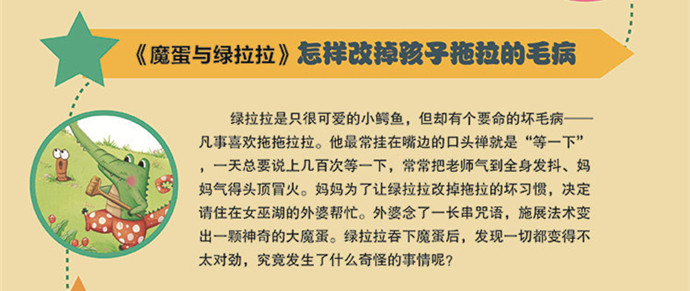 台湾阅读桥梁书是一套从台湾引进的,为4-8岁儿童量身定做的原创阅读桥梁书。能帮助儿童从图片阅读顺利过度到文字阅读。同时,也旨在用生动的故事培养孩子优秀的性格。《魔蛋与绿拉拉》中绿拉拉是只很可爱的小鳄鱼,但却有个要命的坏毛病──凡事喜欢拖拖拉拉。他最常挂在嘴边的口头禅就是“等一下”,一天总要说上几百次等一下,常常把老师气到全身发抖、妈妈气得头顶冒火。妈妈为了让绿拉拉改掉拖拉的坏习惯,决定请住在女巫湖的外婆帮忙。外婆念了一长串咒语,施展法术变出一颗神奇的大魔蛋。绿拉拉吞下魔蛋后,发现一切都变得不太对劲,究竟发生了什么奇怪的事情呢?